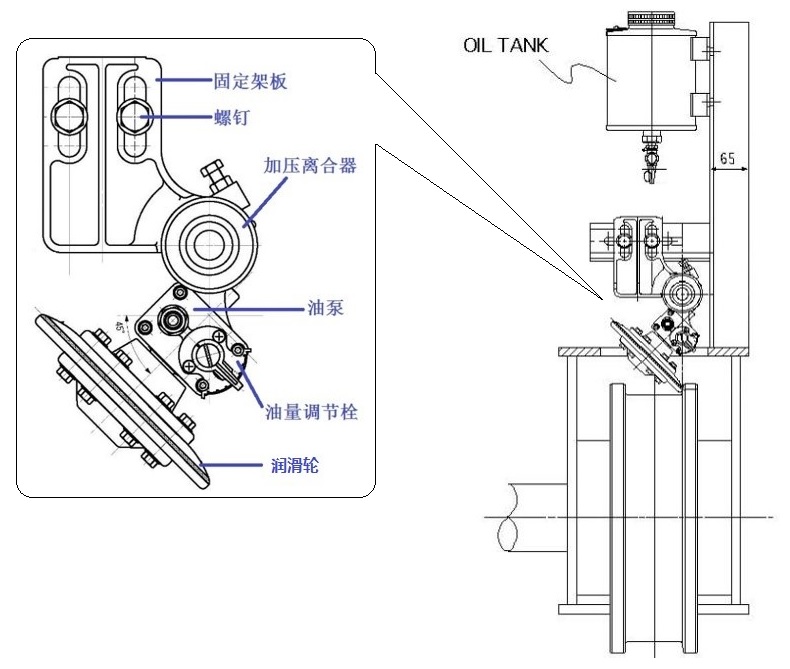 潤(rùn)滑器本體固定在行車上。潤(rùn)滑輪緊貼設(shè)備的車輪輪緣,設(shè)備運(yùn)行時(shí)帶動(dòng)潤(rùn)滑輪旋轉(zhuǎn),以此為動(dòng)力驅(qū)動(dòng)油泵,泵出微量的潤(rùn)滑油并通過(guò)潤(rùn)滑輪均勻涂抹在輪緣側(cè)面。設(shè)備前后運(yùn)行時(shí),潤(rùn)滑器均可出油,設(shè)備停止后,油泵同時(shí)停止工作,保證關(guān)閉出油,避免潤(rùn)滑油外泄。