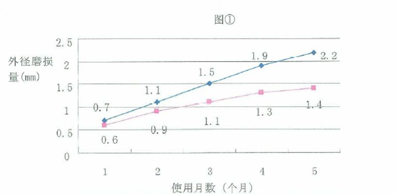 結(jié)果解說:圖①的圖表在最初2個(gè)月雖然看不出明顯的變化,從3個(gè)月以后起無涂油的鋼絲繩的磨損量在顯著增加。從表②的結(jié)果可看出通過涂油,大量地減少了斷絲數(shù)的同時(shí),繩芯也能夠含有油,使鋼絲繩保持在較好的使用狀態(tài)!